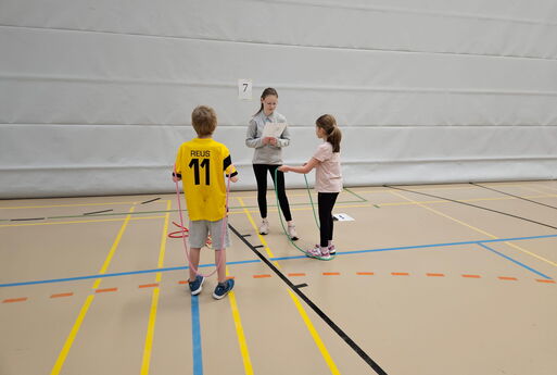 An verschiedenen Bewegungsstationen konnten die Grundschülerinnen und Grundschüler zeigen, wie gut sie z.B. dribbeln, rollen, Seil springen oder genau werfen können.