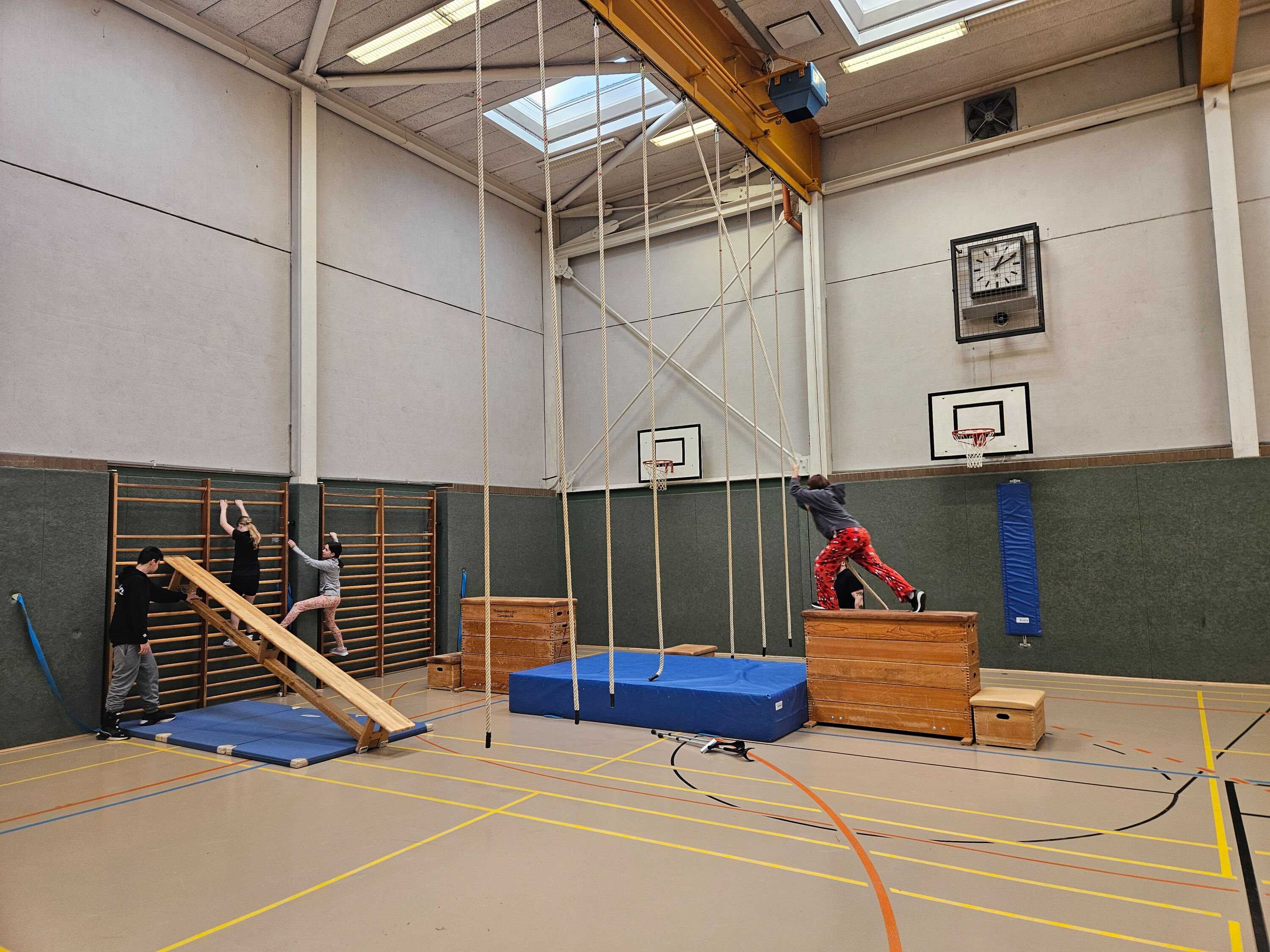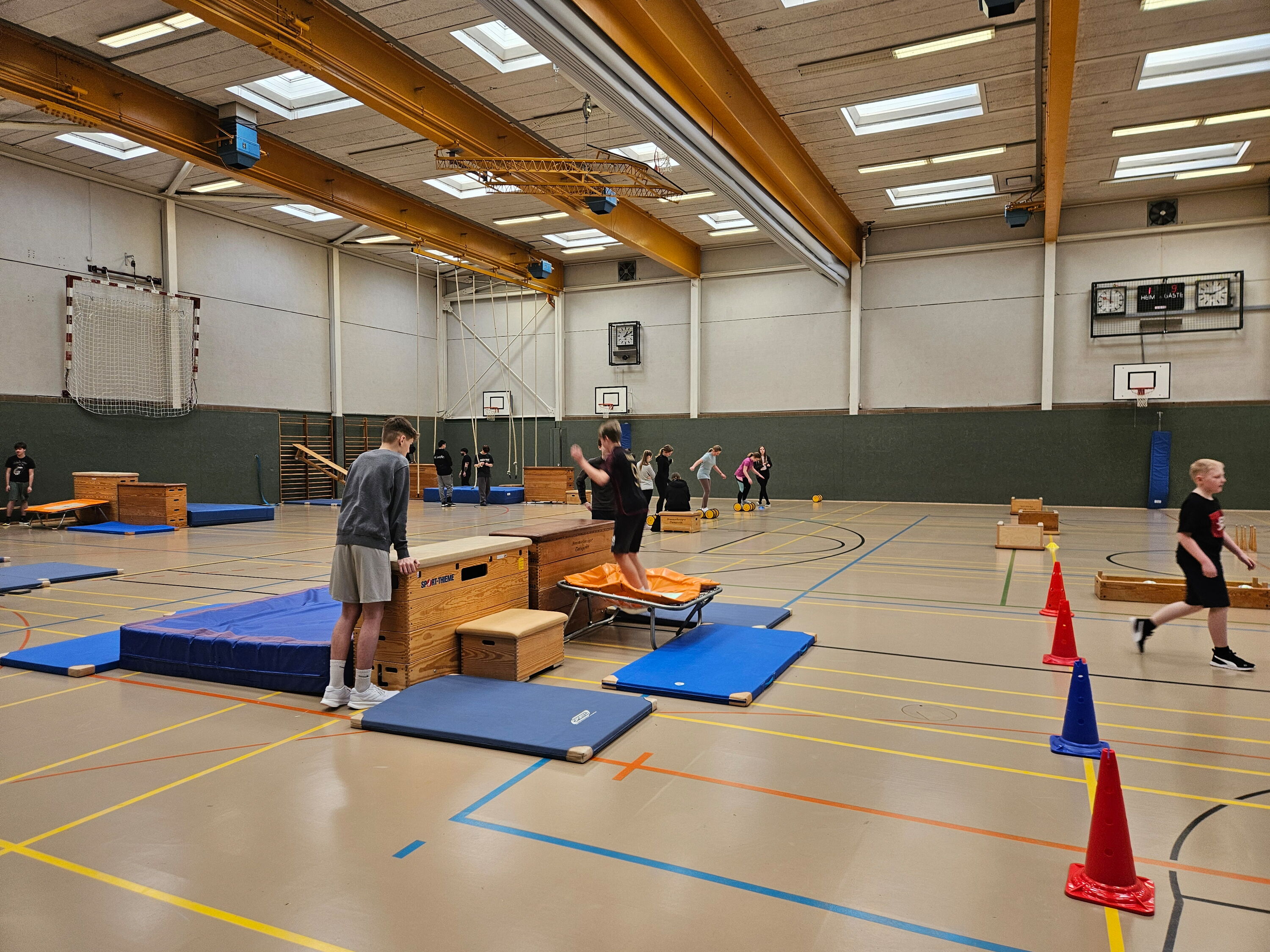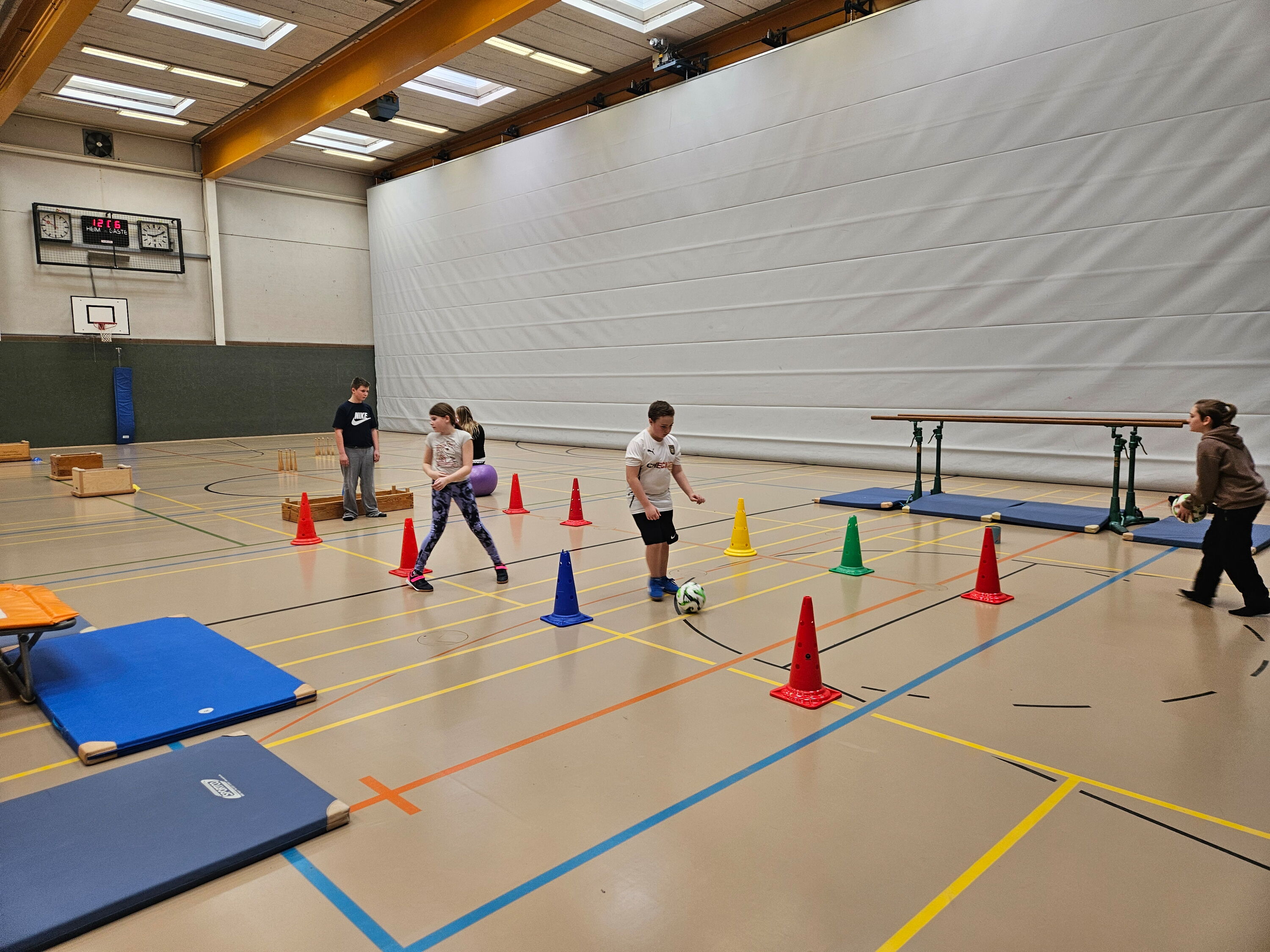 Am 20.01.2026 hat der Kurs 10 „Fit im Alltag“ einen abwechslungsreichen Sportparcours für die beiden 5. Klassen organisiert. Der Parcours bestand aus sieben Stationen, an denen die Schülerinnen und Schüler ihre Geschicklichkeit, Kraft und Koordination unter Beweis stellen konnten. Es wurde gedribbelt, gesprungen, gestützt und geturnt. Außerdem fuhren die Kinder Pedalo und schwangen sich mit viel Spaß an einem Seil. Die Fünftklässler waren mit großer Begeisterung dabei und hatten sichtlich Freude an der sportlichen Herausforderung.